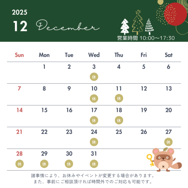 12月の営業カレンダーをお届けします。