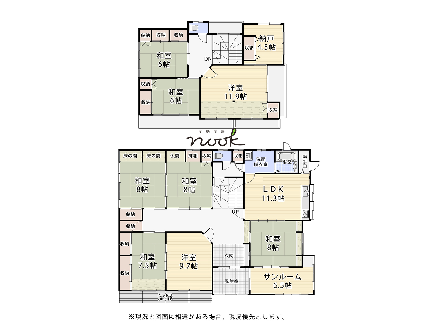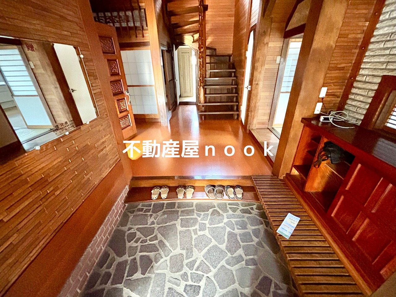 床の間や欄間を備えた本格和室が複数あり、縁側や石張りの玄関など、随所に重厚な意匠が息づいています。2階には11.9帖の洋室と4.5帖の納戸を備え、収納力も十分。三世代同居や二世帯住宅をご検討の方にもおすすめです。